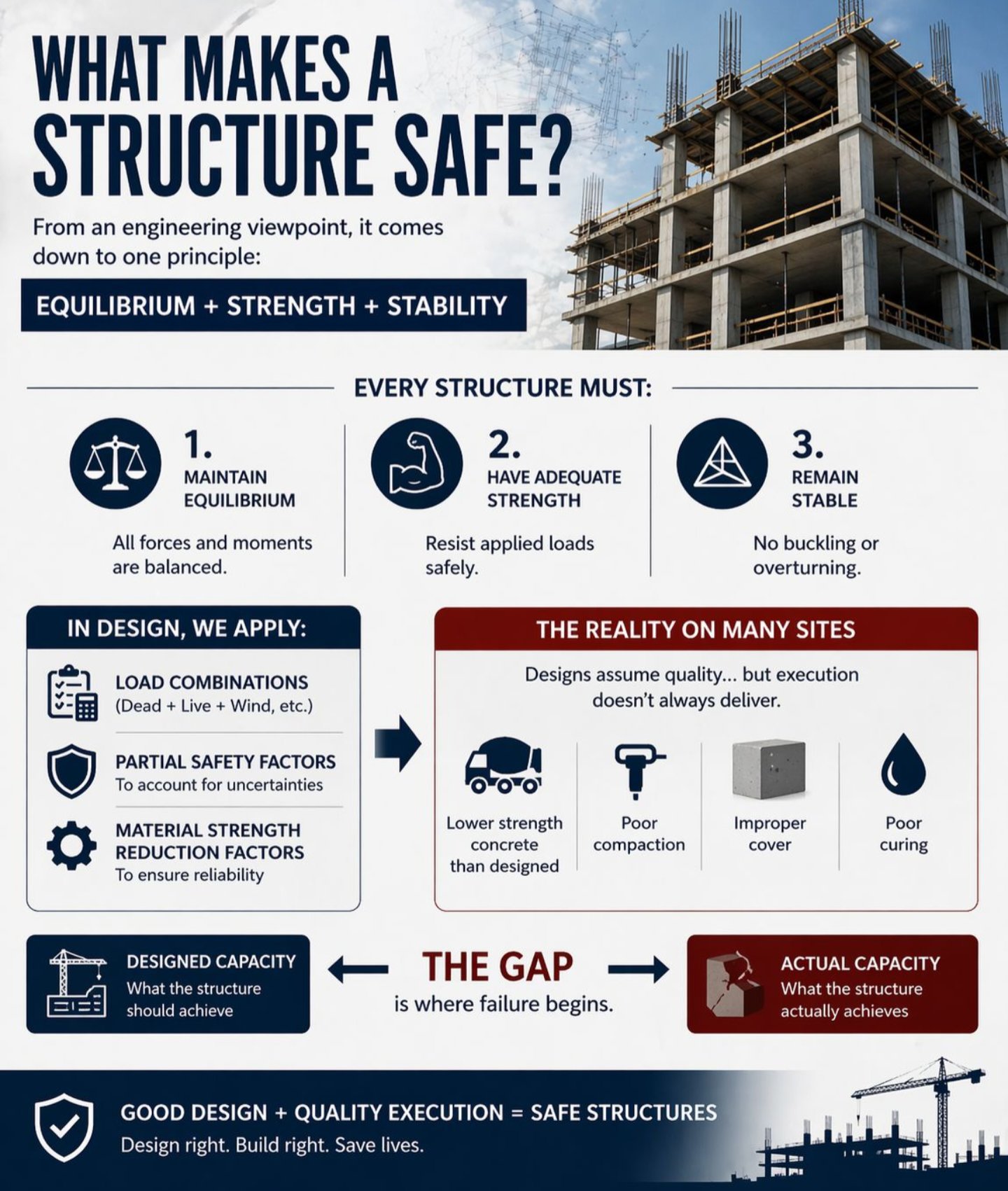 When the actual capacity of a structure falls below the designed capacity, the safety margins provided by engineers are eroded. This gap is where failure begins. For a structure to be truly safe, the industry must pair good design with quality execution.